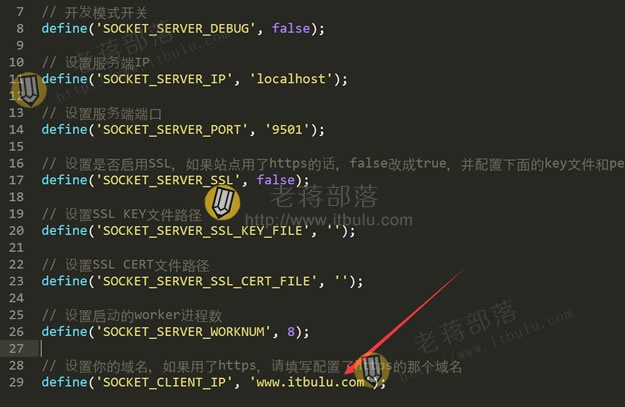 修改”socket.config.php”配置文件”SOCKET_CLIENT_IP”,后面加上我们微擎的域名。如果我们有启用SSL证书,则上面还需要对应SSL部分修改。